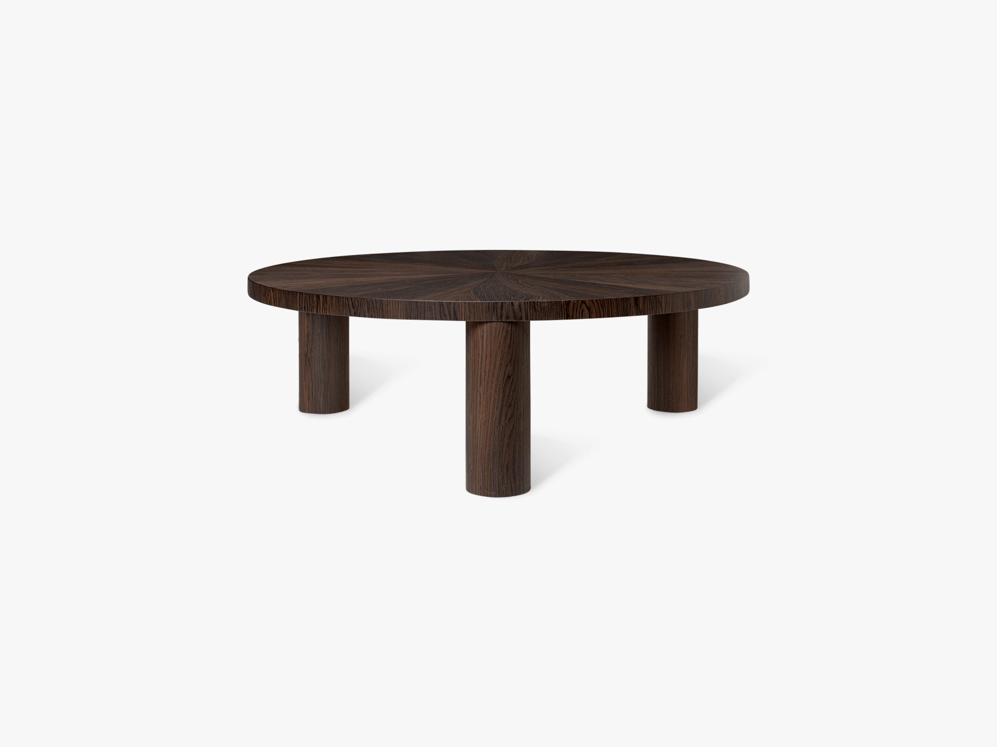 Post Coffee Table er inspireret af brutalismen, og i designet er der leget med forskellige volumener for at skabe enkelt, rundt sofabord med fascinerende detaljer. Bordet er lavet af FSC®-certificeret træ og har tre robuste cylinderformede ben, mens bordpladen har en elegant og unik beklædning af egetræsfiner med sfæriske elementer, der er skabt ved hjælp af en teknik, der kaldes dekupørarbejde. Brug flere borde i forskellige størrelser til at skabe et sammenhængende landskab i to niveauer.
